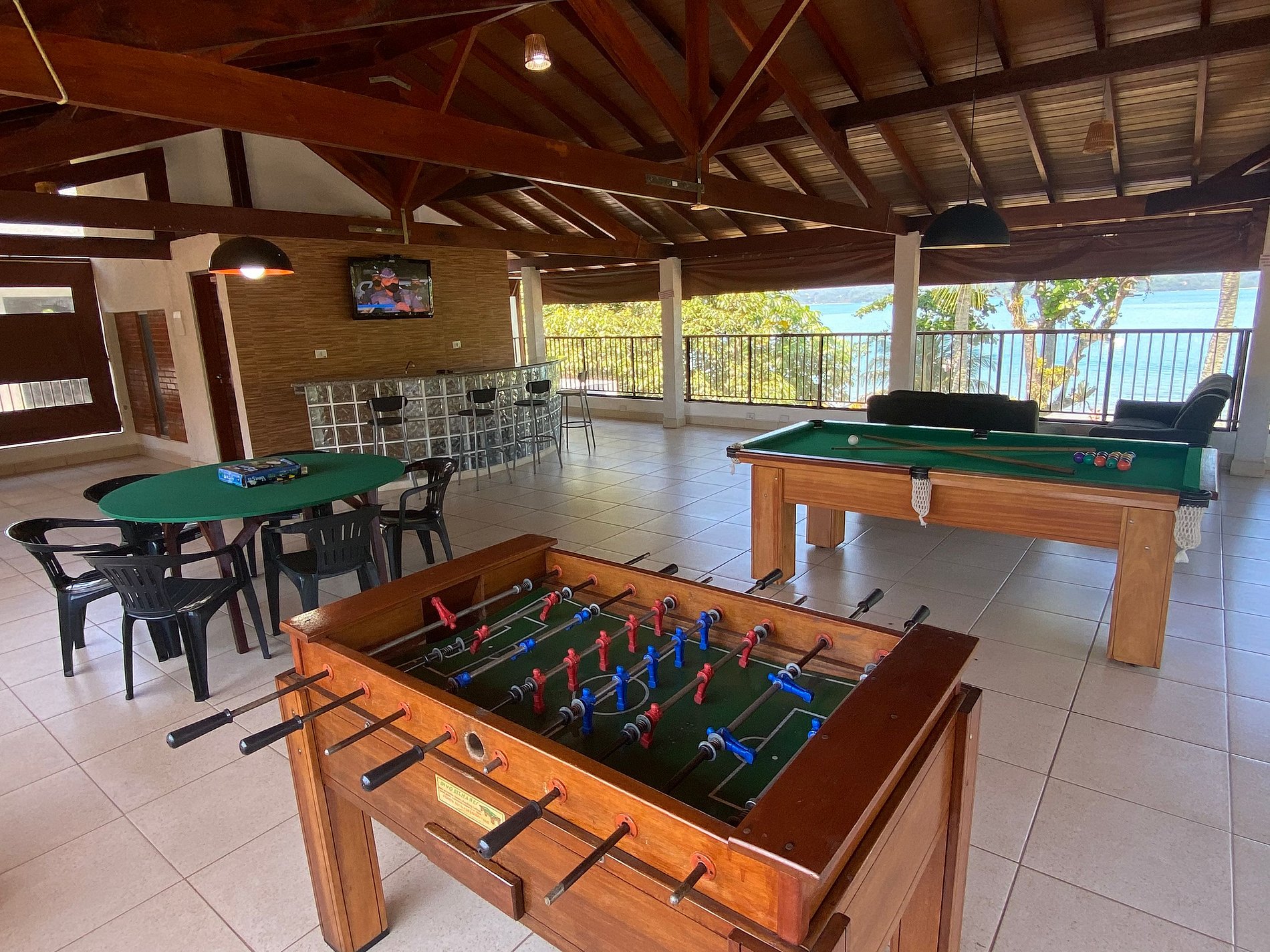 No último andar tem um amplo salão de jogos com tv, pebolim, bilhar e mesa para cartas. A piscina é uma delícia.