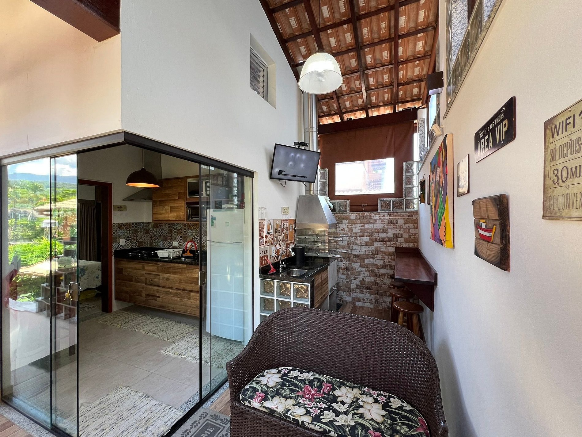 Apartamento com suíte, cozinha completo, ar condicionado split, ventilador de teto, Smart Tv 32, wi-fi, área gourmet completa com vista para o mar, sofás e bancada para refeições, 1 vaga de estacionamento fechada