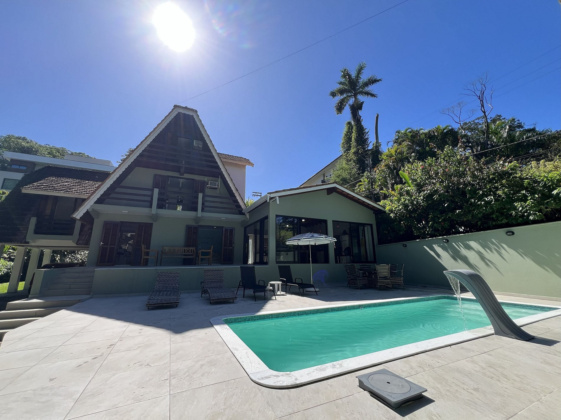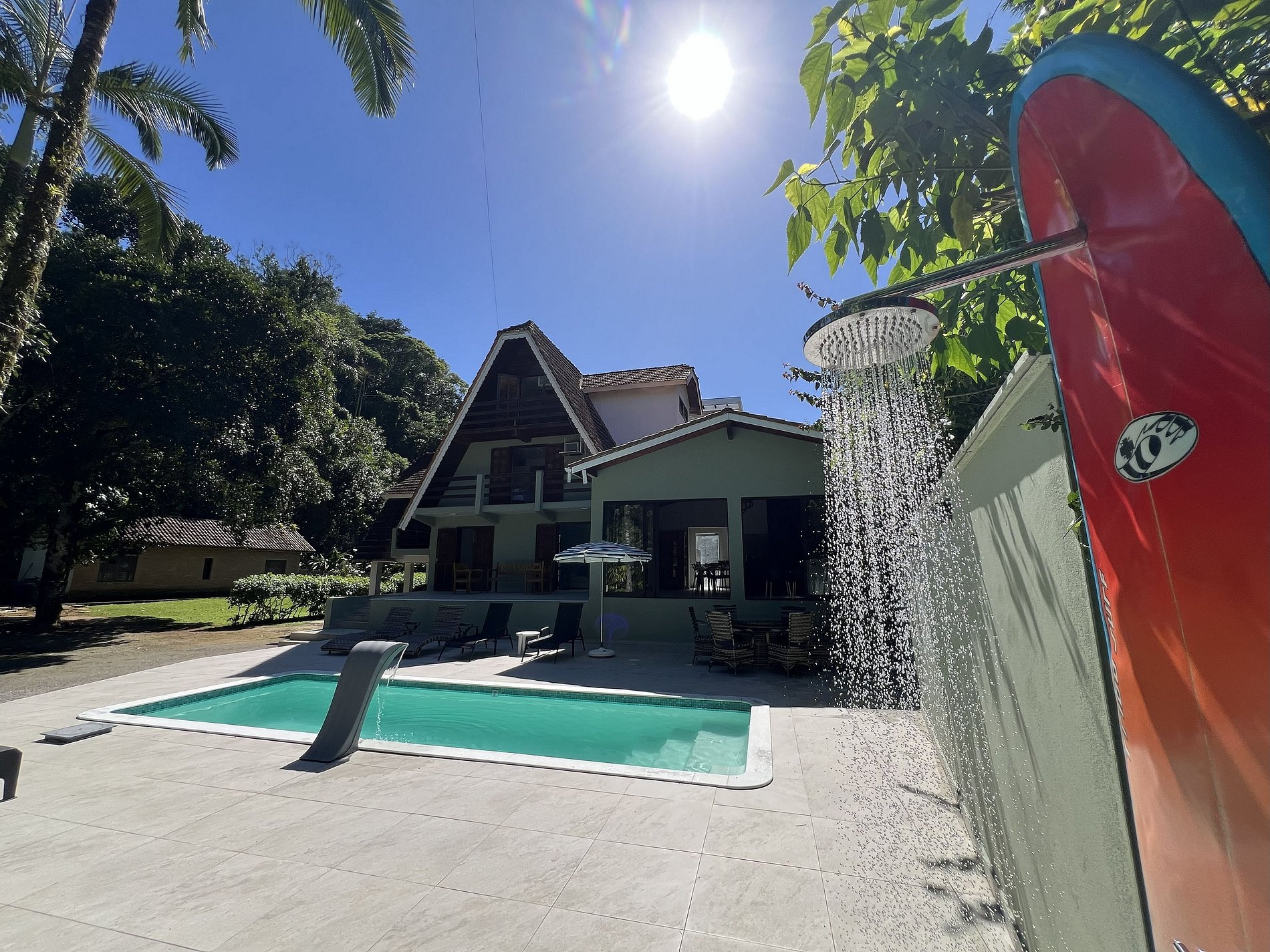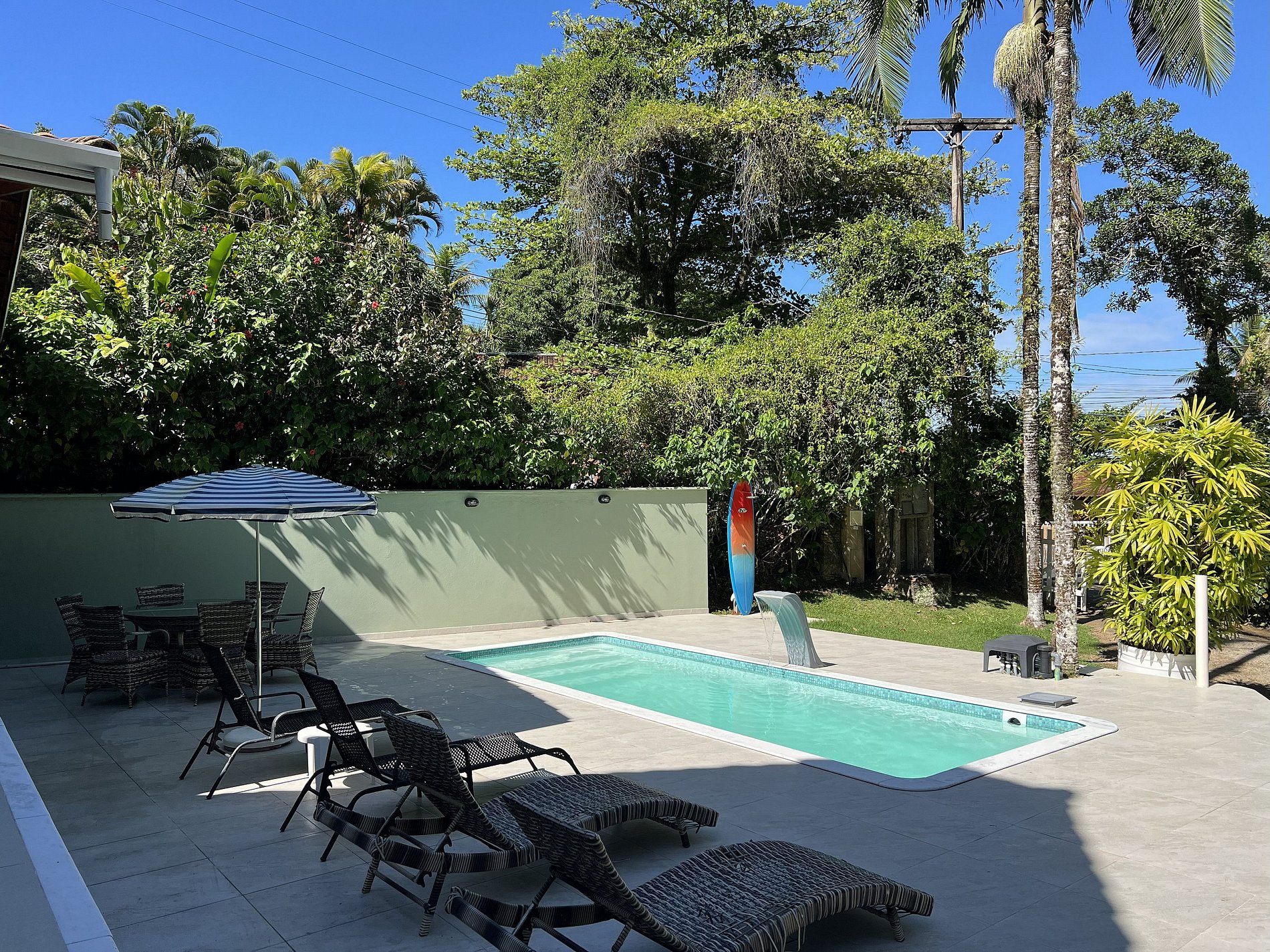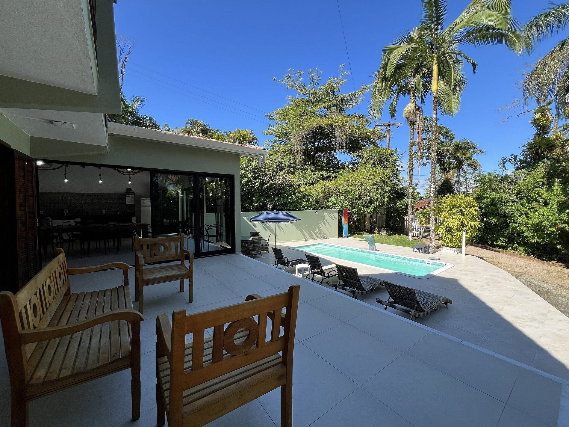 A área externa é encantadora, com ampla piscina, espreguiçadeiras, mesa com 4 cadeiras e um belo jardim envolto por muito verde.