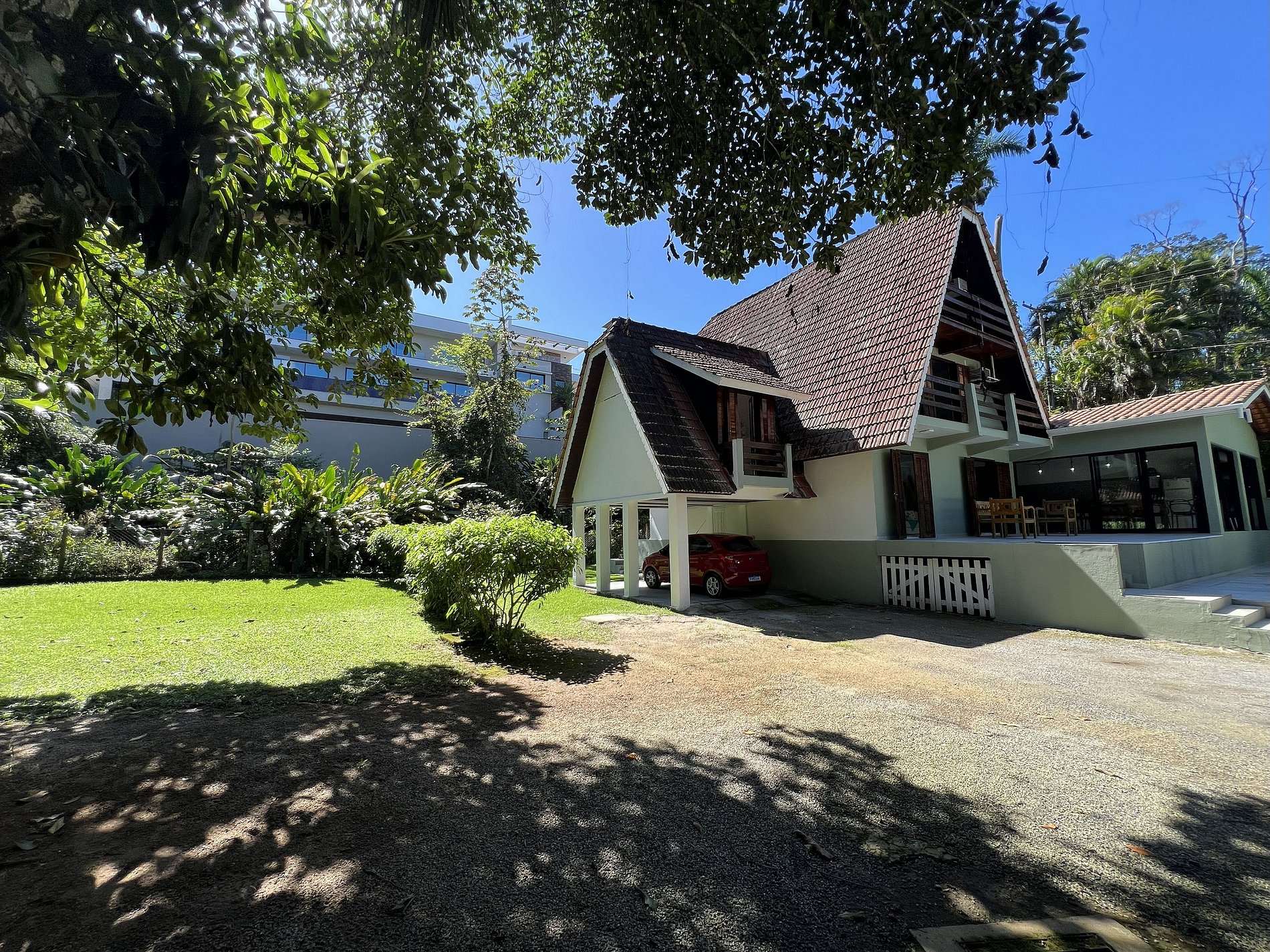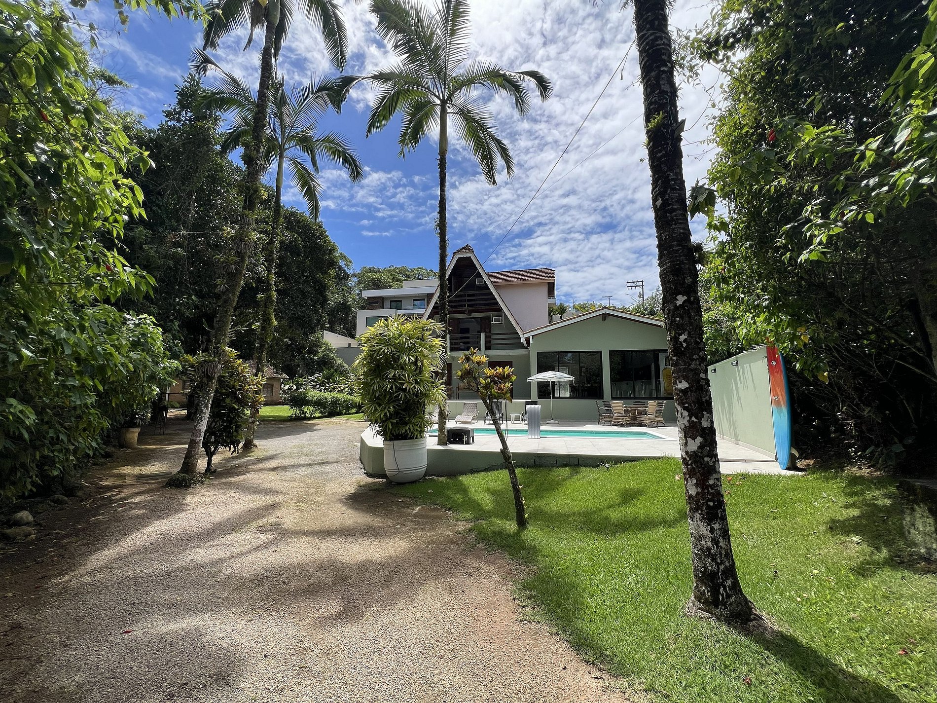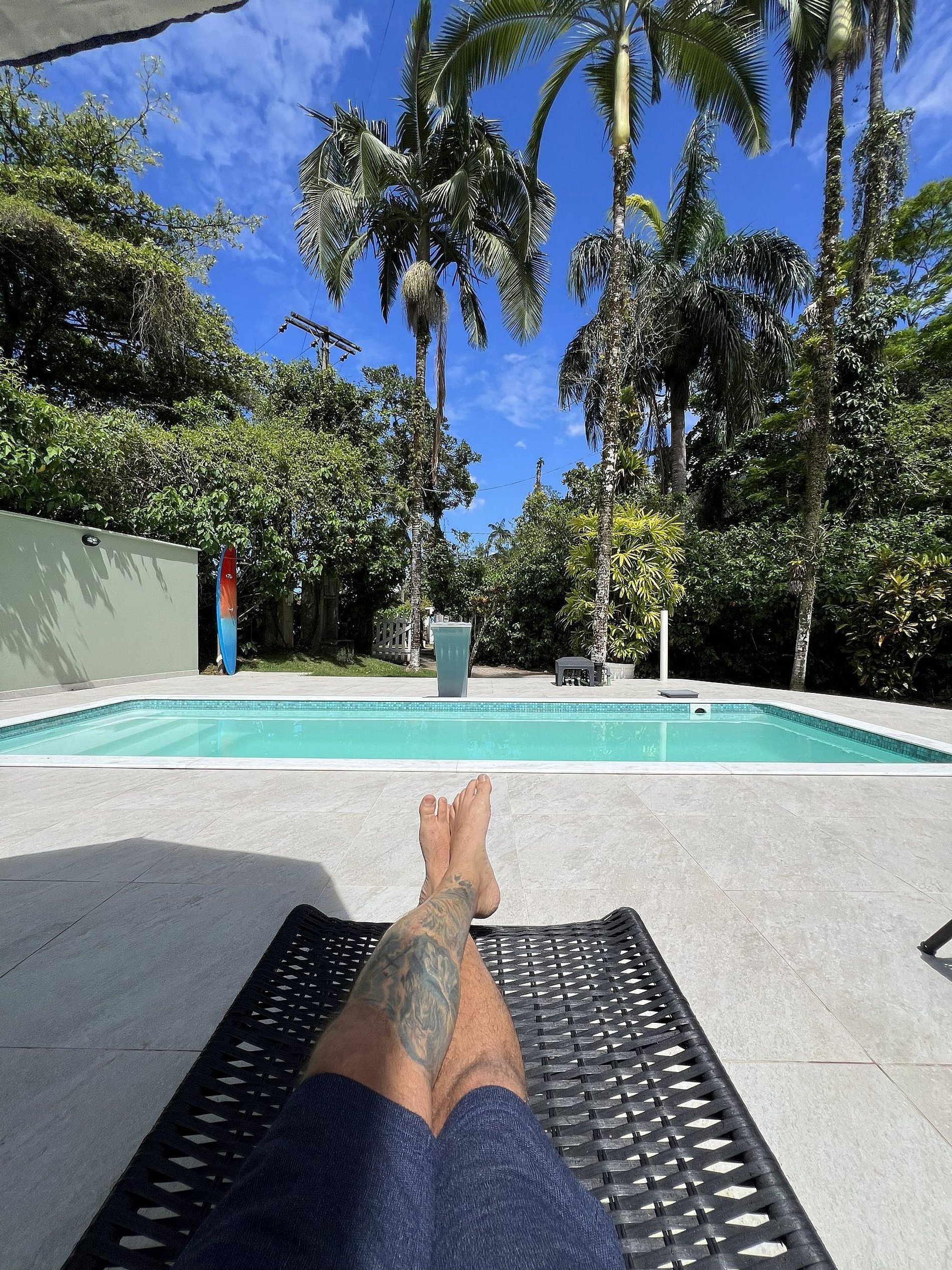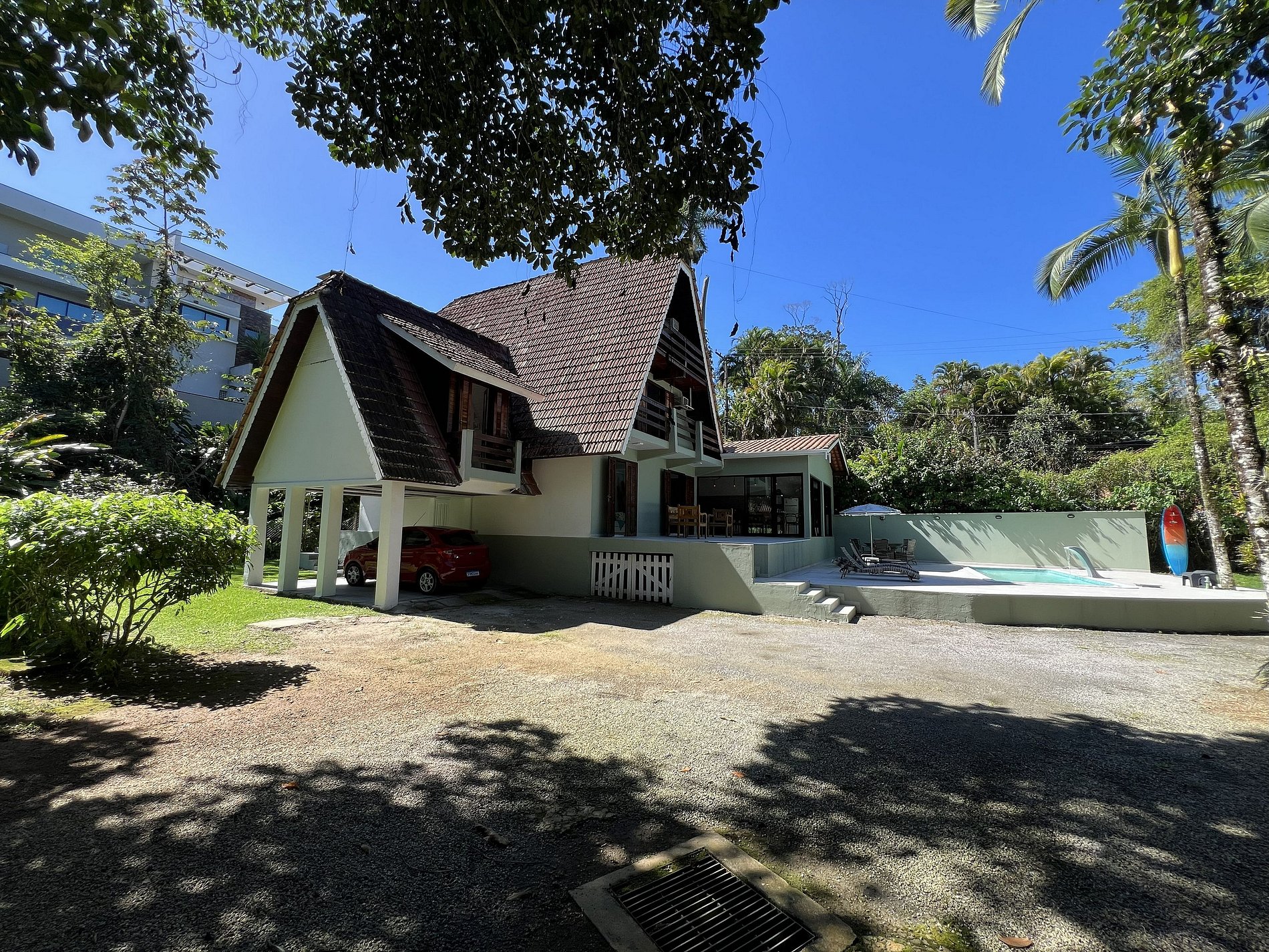 A área externa é encantadora, com ampla piscina, espreguiçadeiras, mesa com 4 cadeiras e um belo jardim envolto por muito verde.