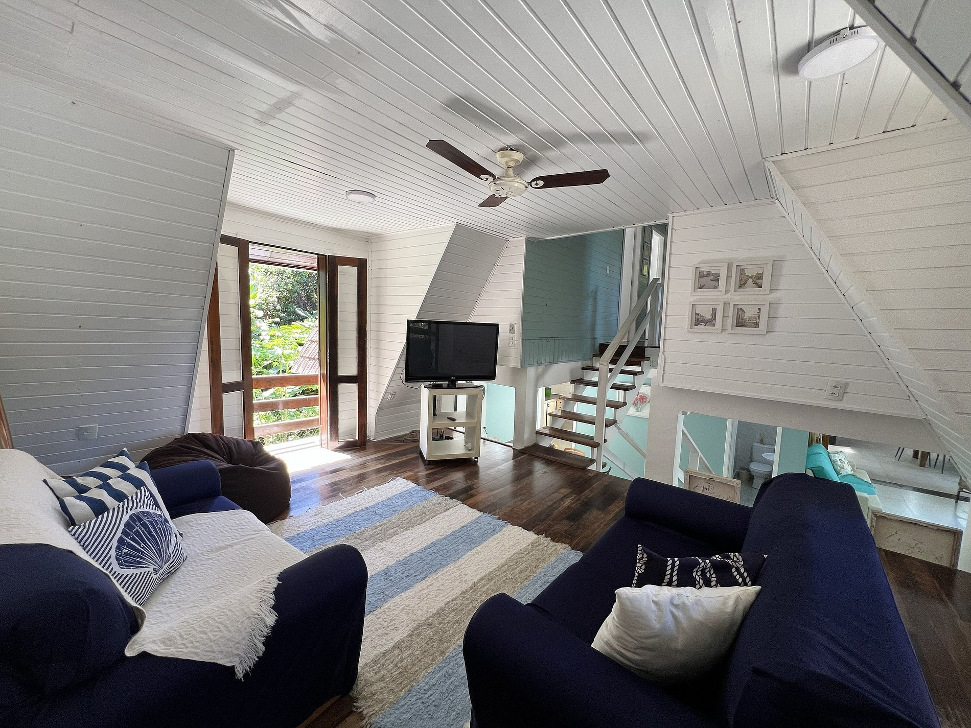 Ambientes amplos e bem distribuídos: sala de estar com 2 sofás e mesa para 6 pessoas, sala de TV com 2 sofás e puff, lavabo e internet Wi-Fi.