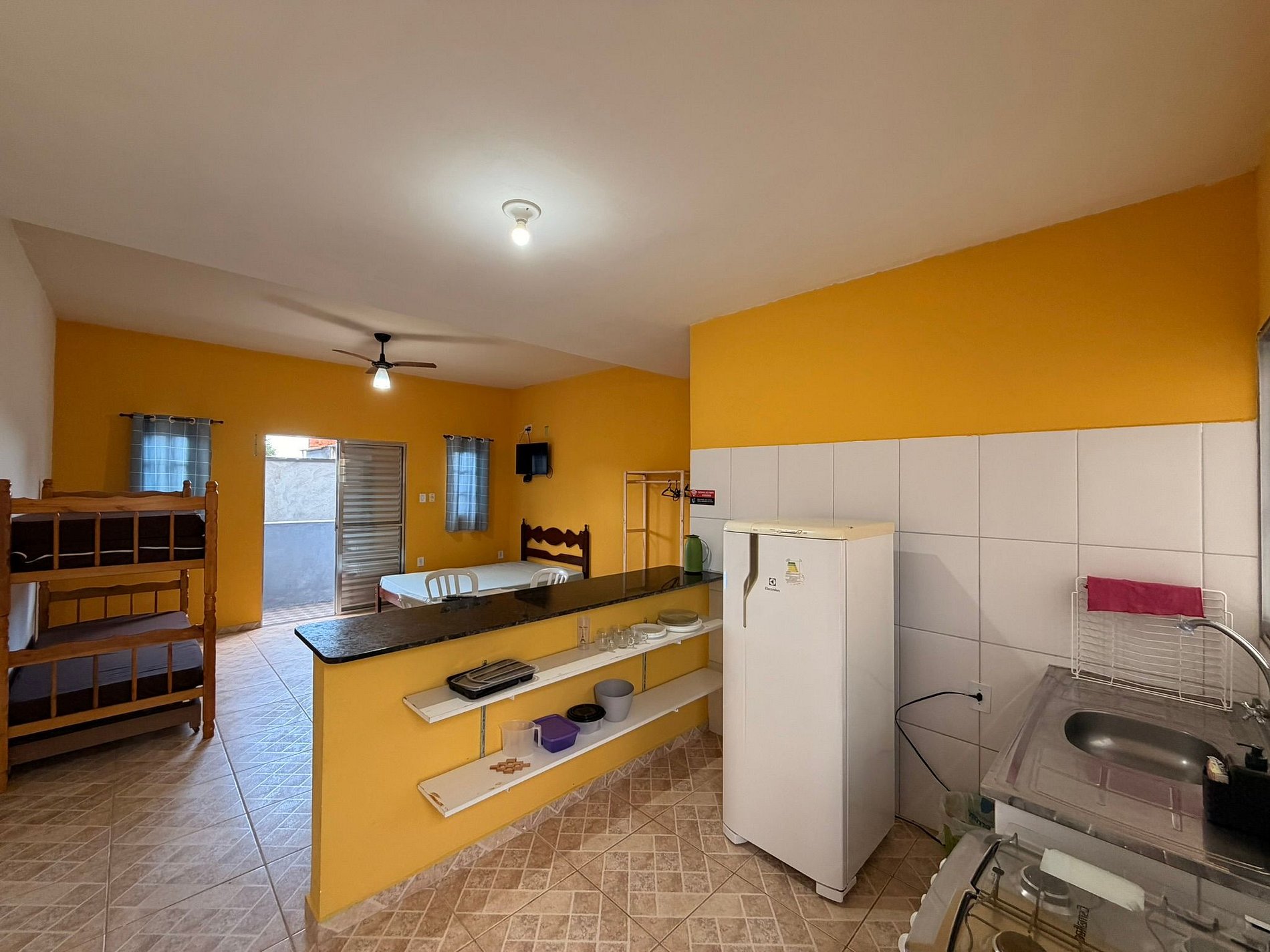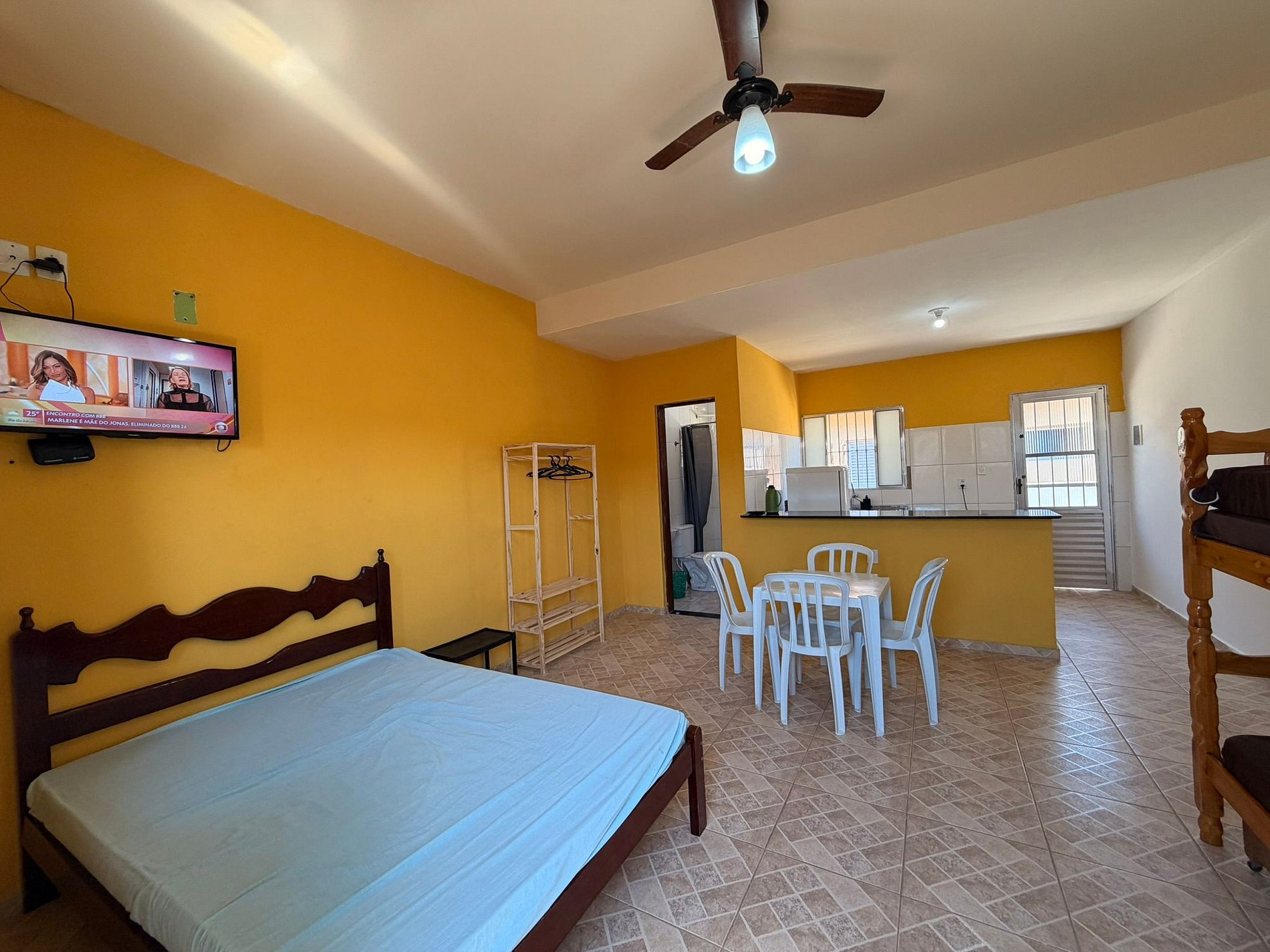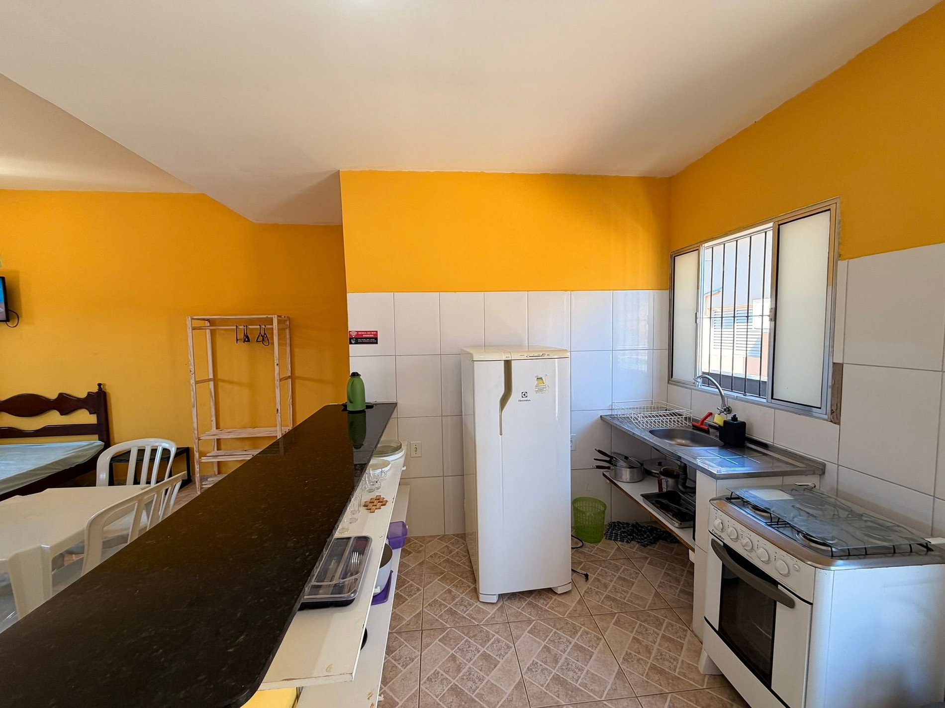 O espaço é equipado com TV, internet Wi-Fi e cozinha completa, com geladeira, fogão e todos os utensílios necessários para uma estadia confortável.