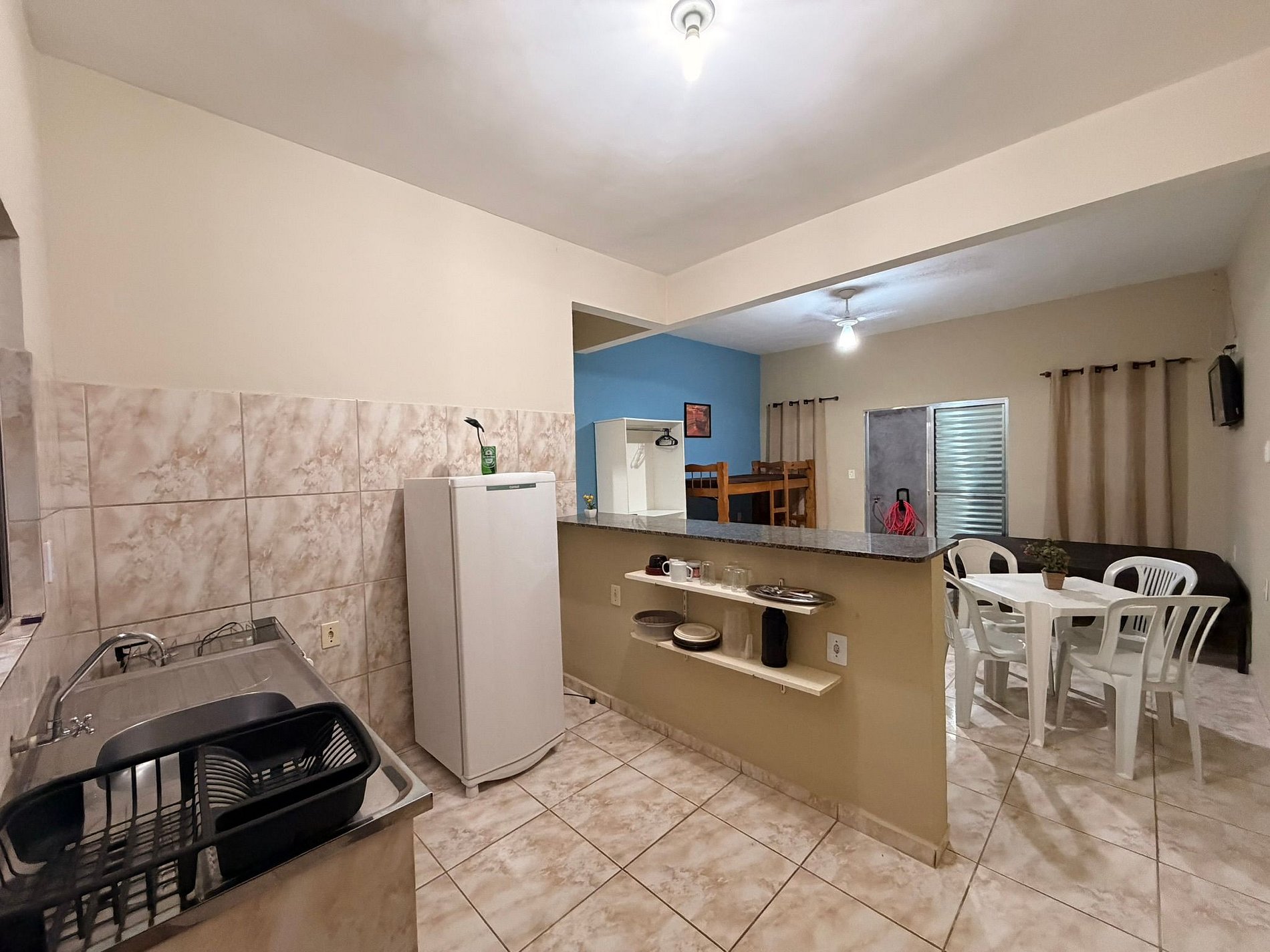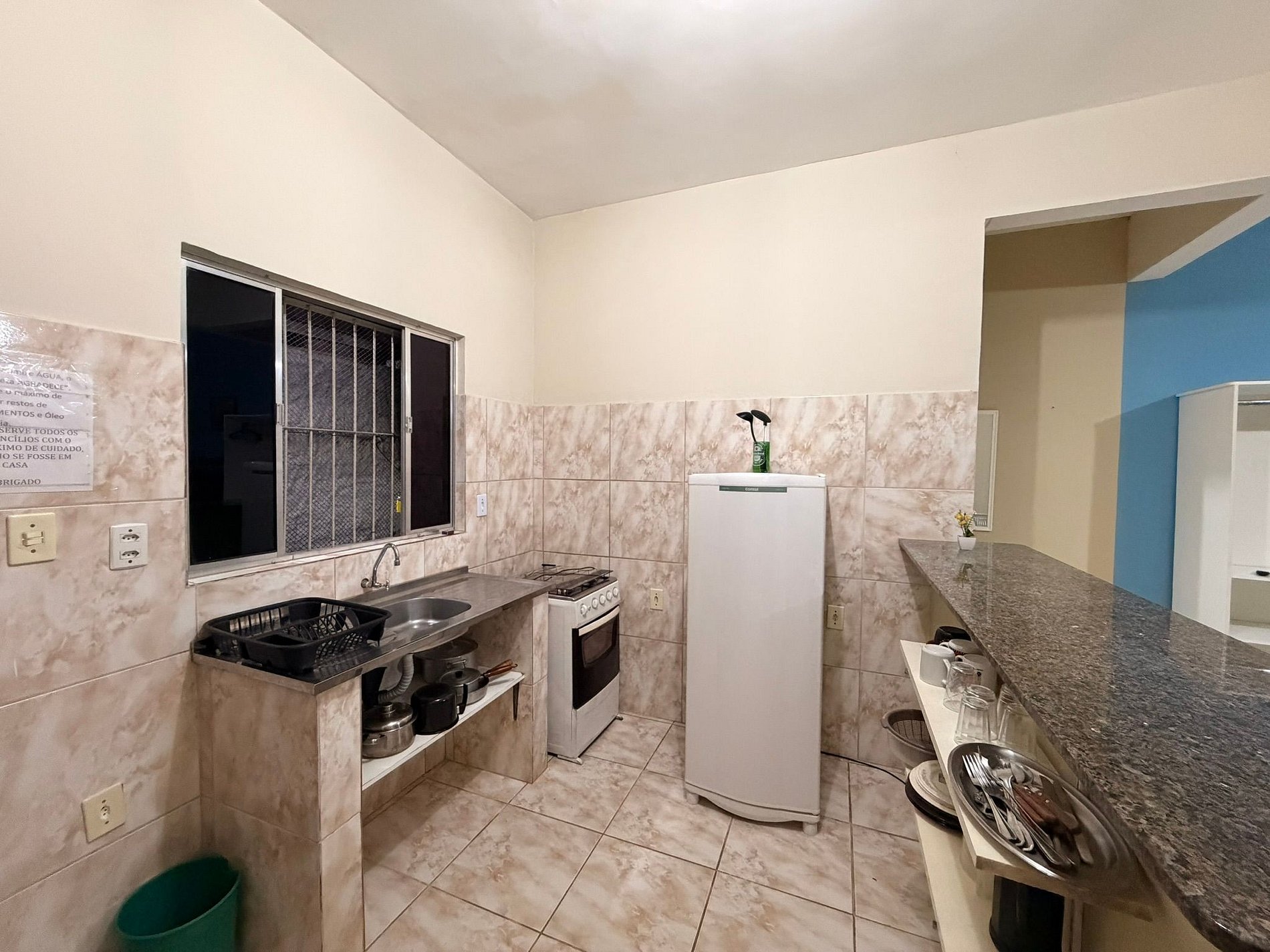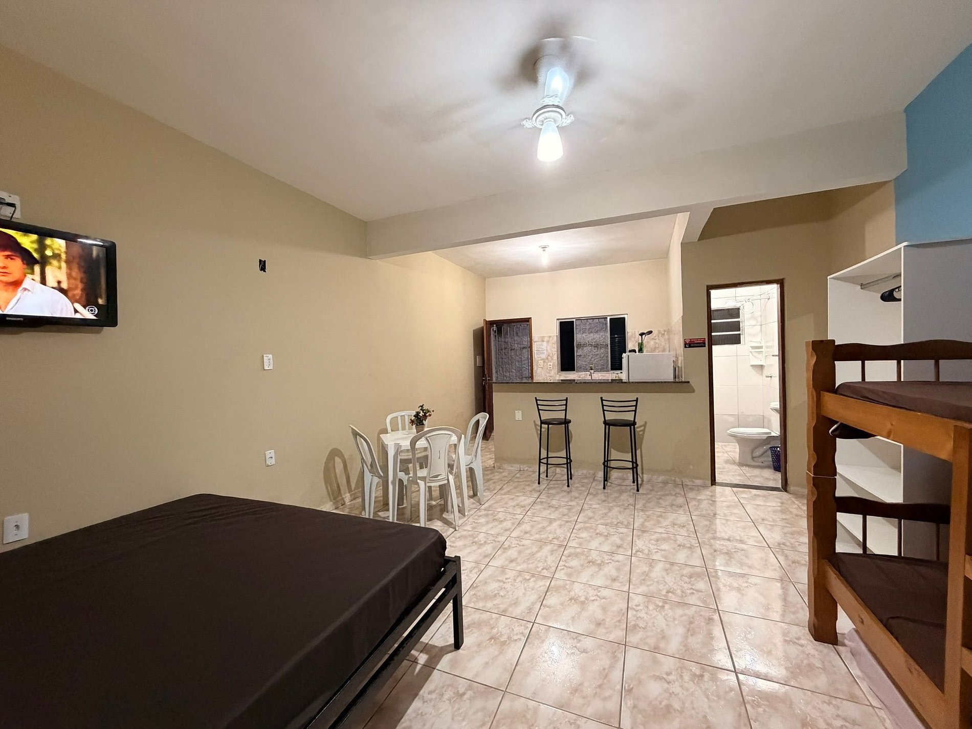 O espaço é equipado com TV, internet Wi-Fi e cozinha completa, com geladeira, fogão e todos os utensílios necessários para uma estadia confortável.