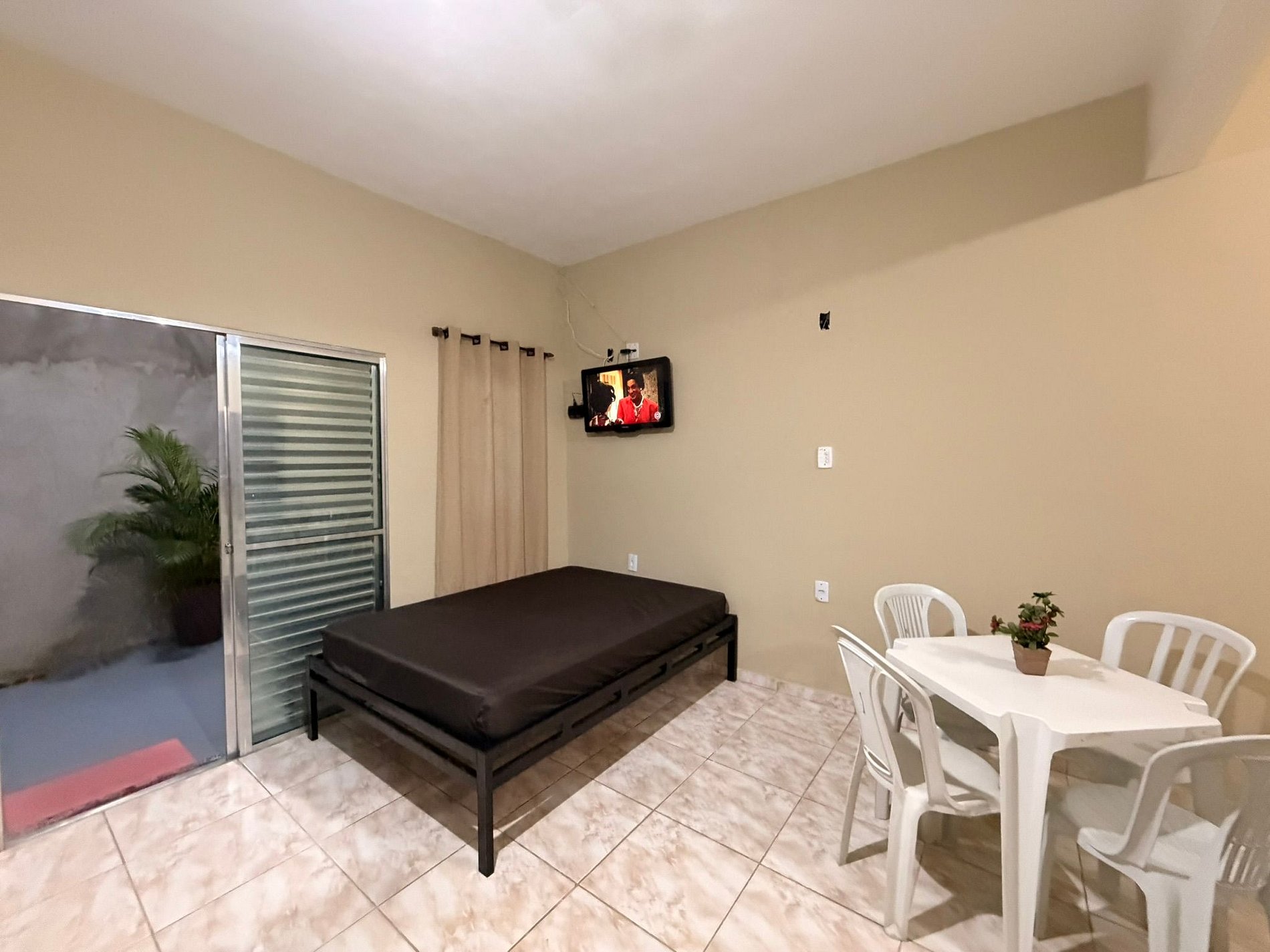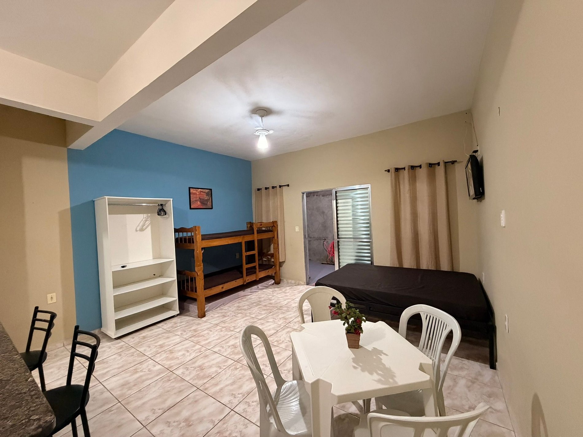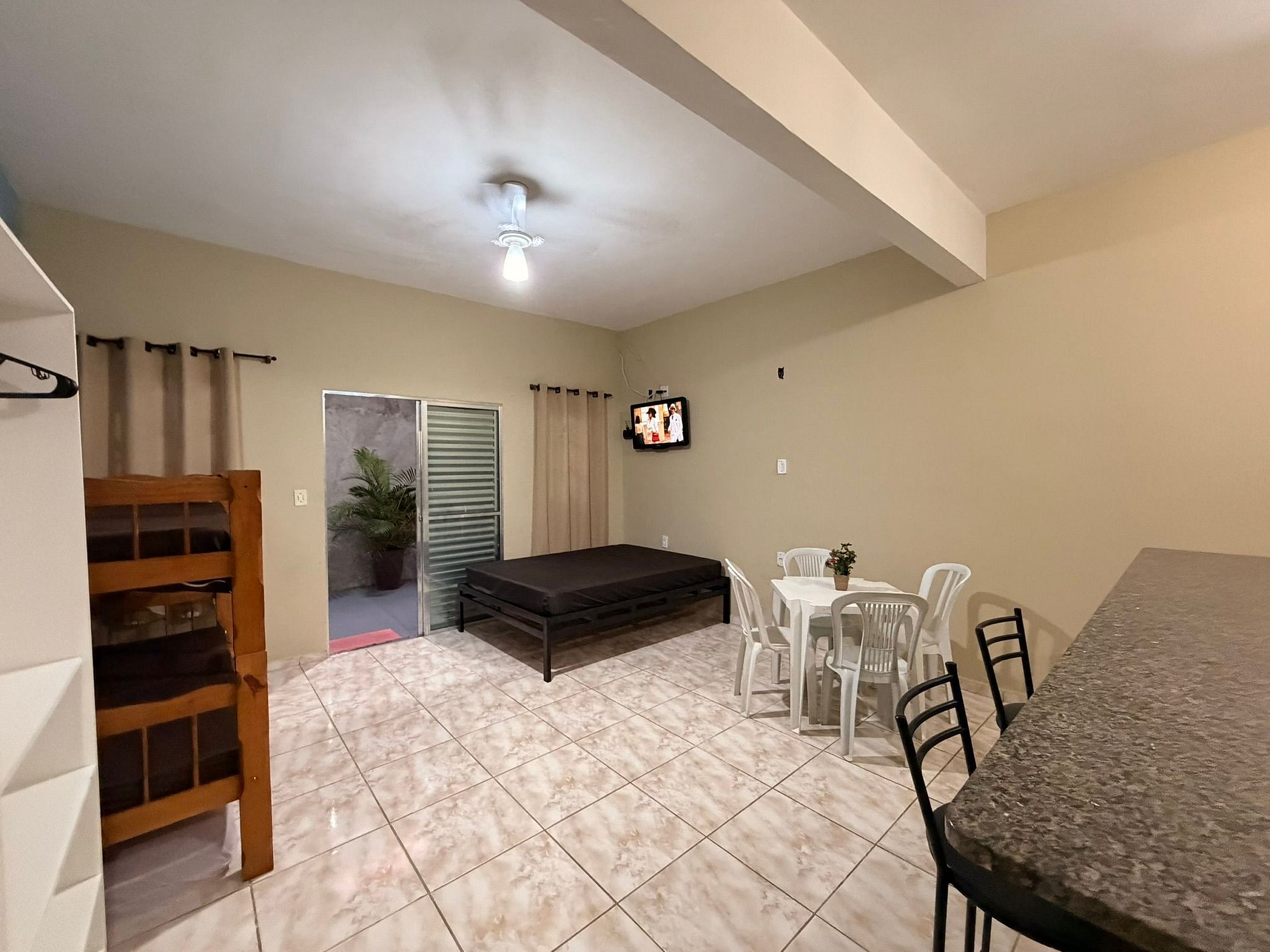 O espaço é equipado com TV, internet Wi-Fi e cozinha completa, com geladeira, fogão e todos os utensílios necessários para uma estadia confortável.