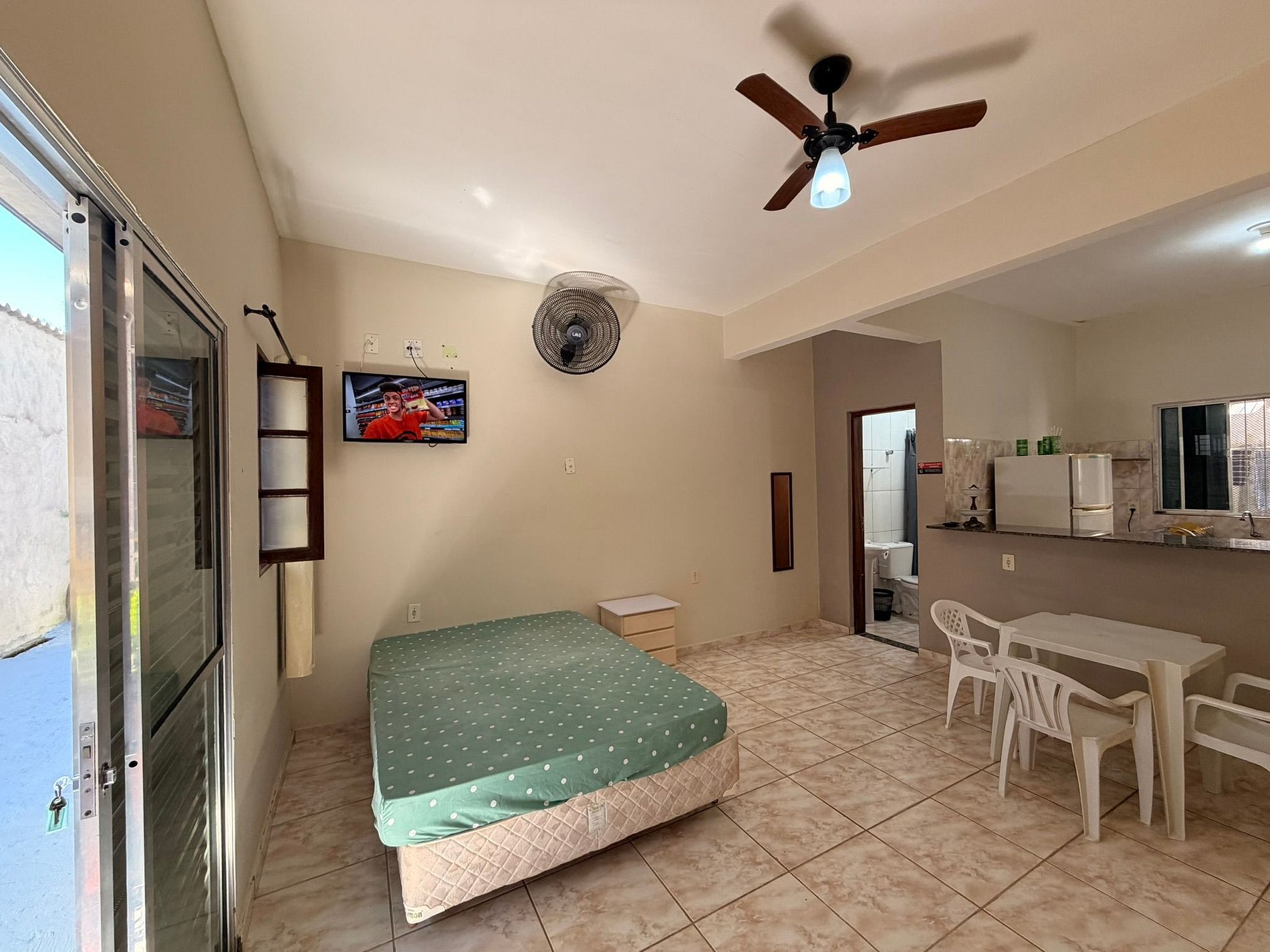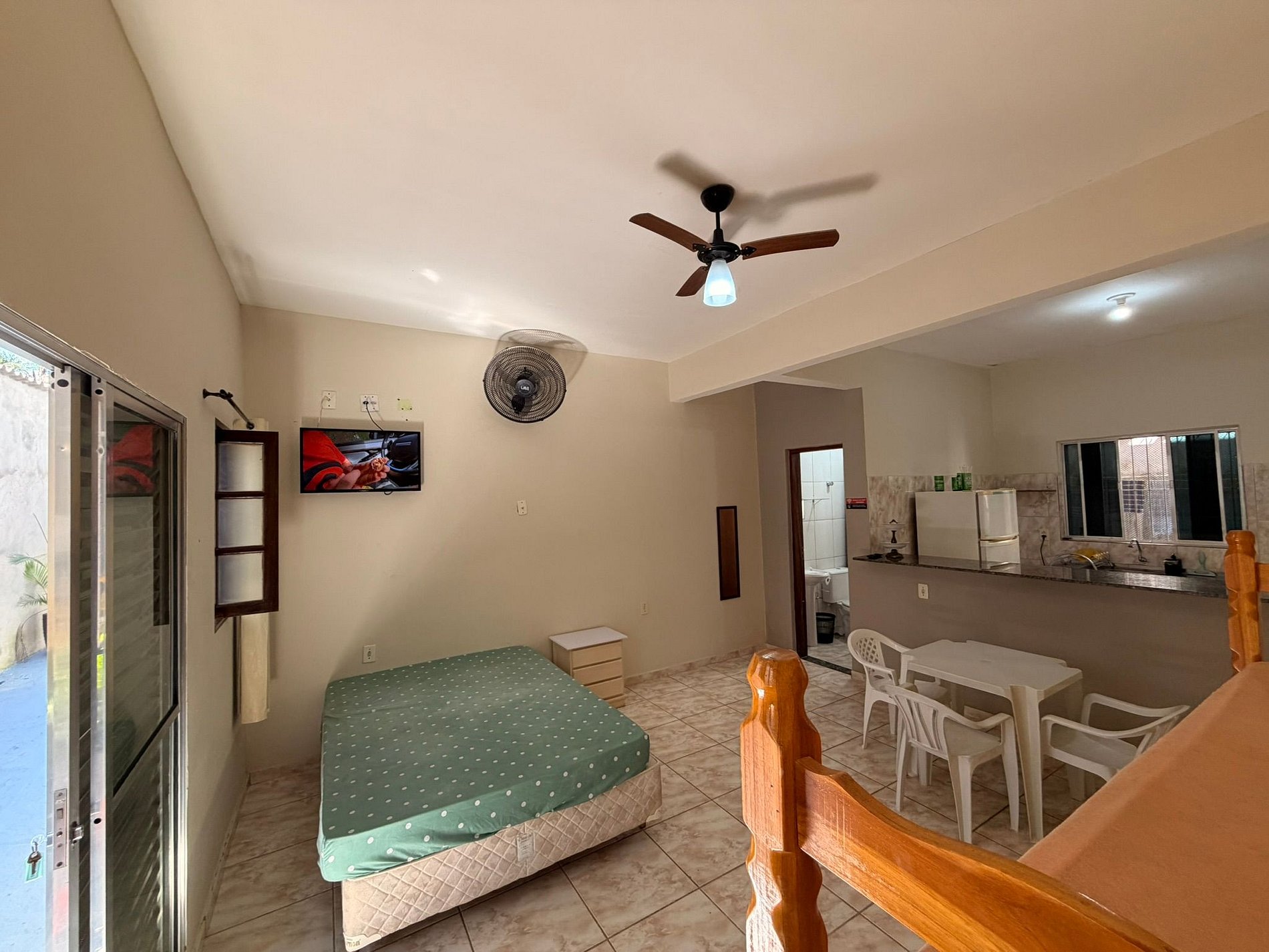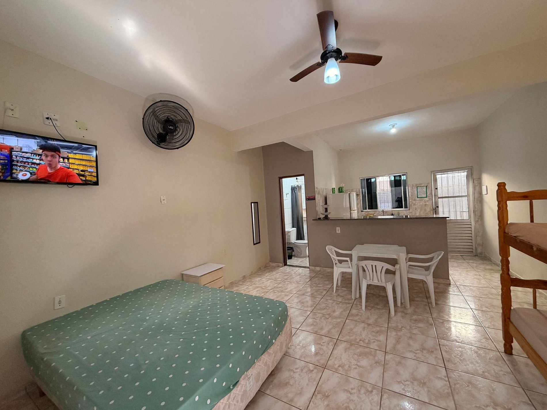 O espaço é equipado com TV, internet Wi-Fi e cozinha completa, com geladeira, fogão e todos os utensílios necessários para uma estadia confortável.