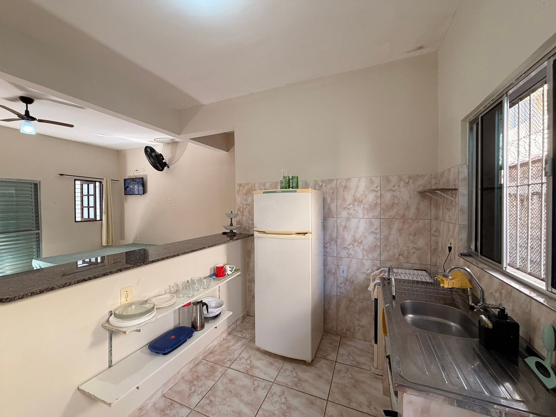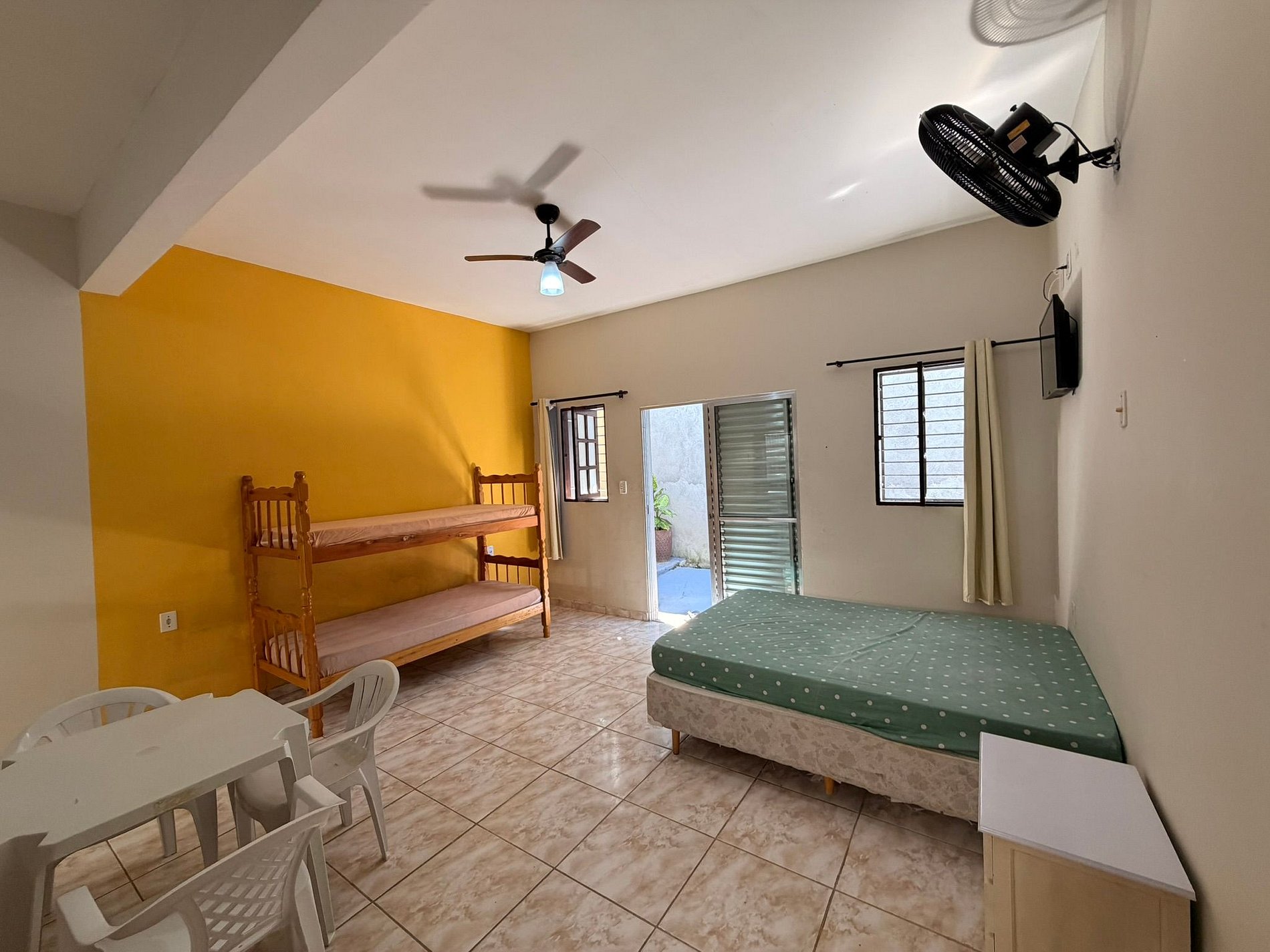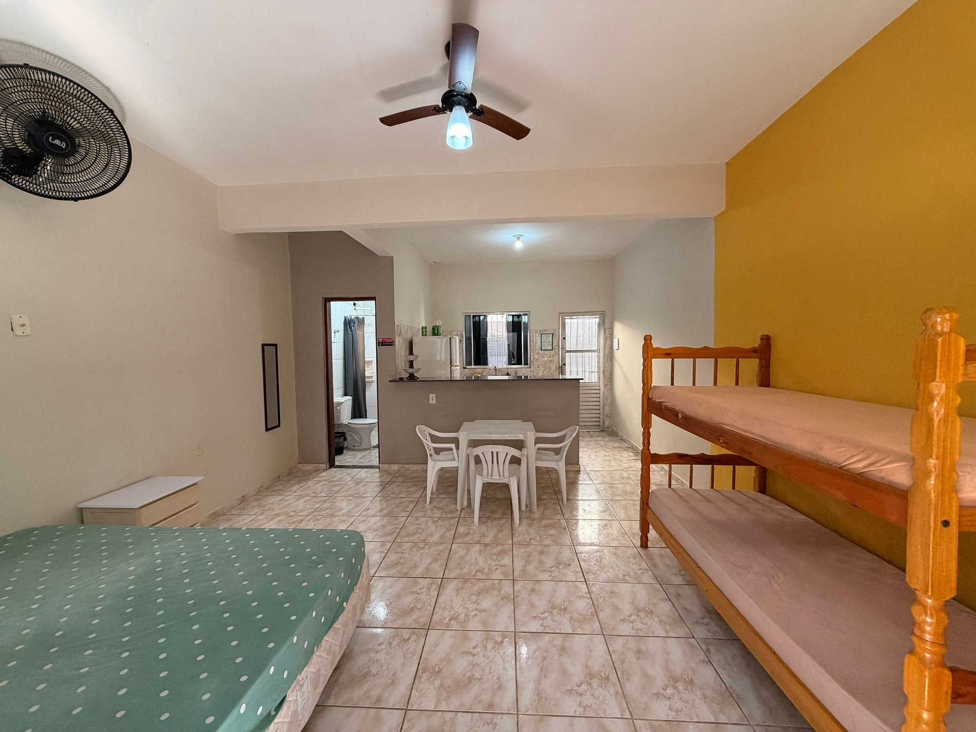 O espaço é equipado com TV, internet Wi-Fi e cozinha completa, com geladeira, fogão e todos os utensílios necessários para uma estadia confortável.