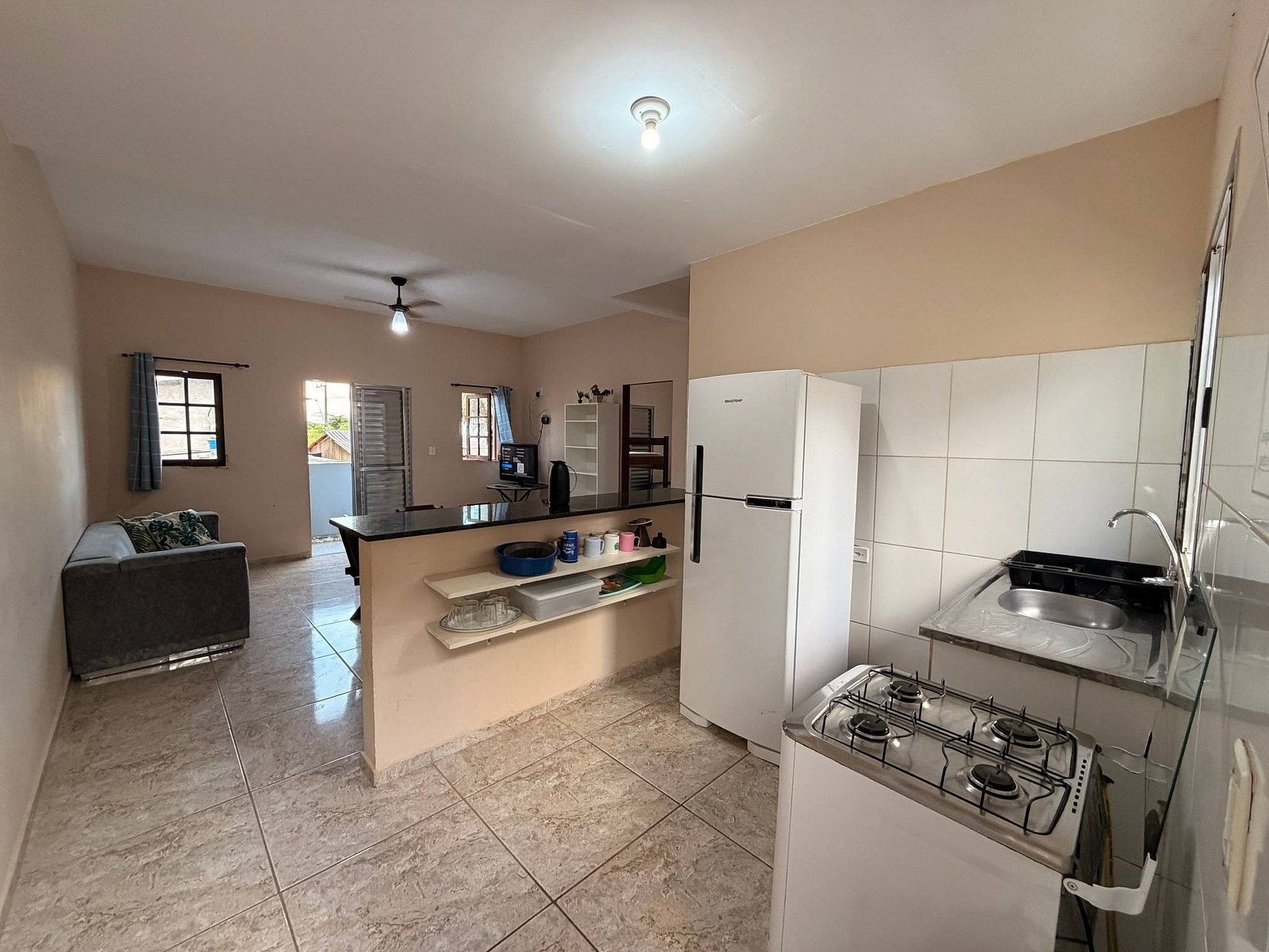 A cozinha é completa e equipada com geladeira, fogão, panelas, pratos, talheres e diversos utensílios, permitindo que os hóspedes preparem suas refeições com tranquilidade. O apartamento também possui um ambiente agradável e funcional, pensado para proporcionar uma estadia confortável.