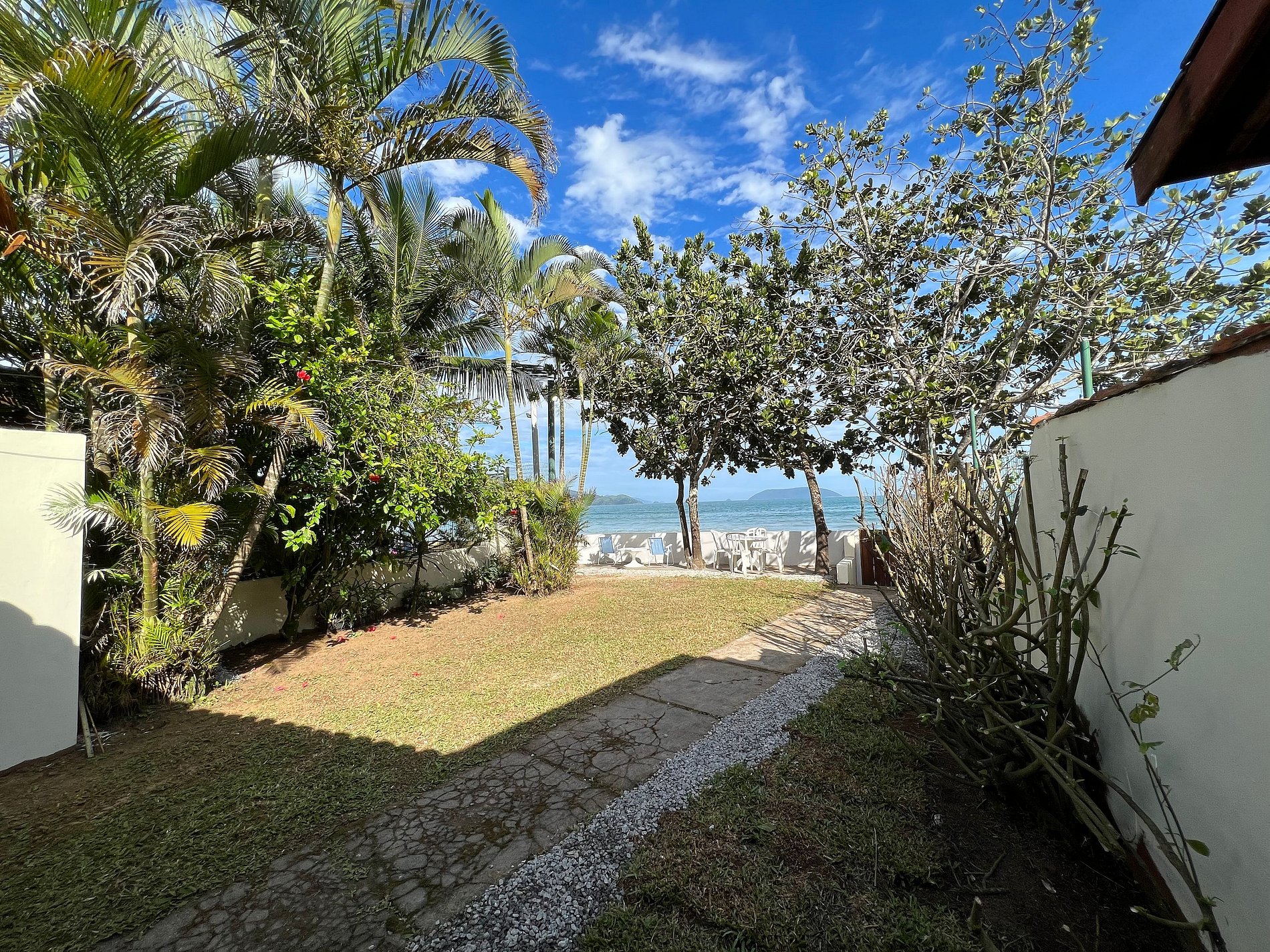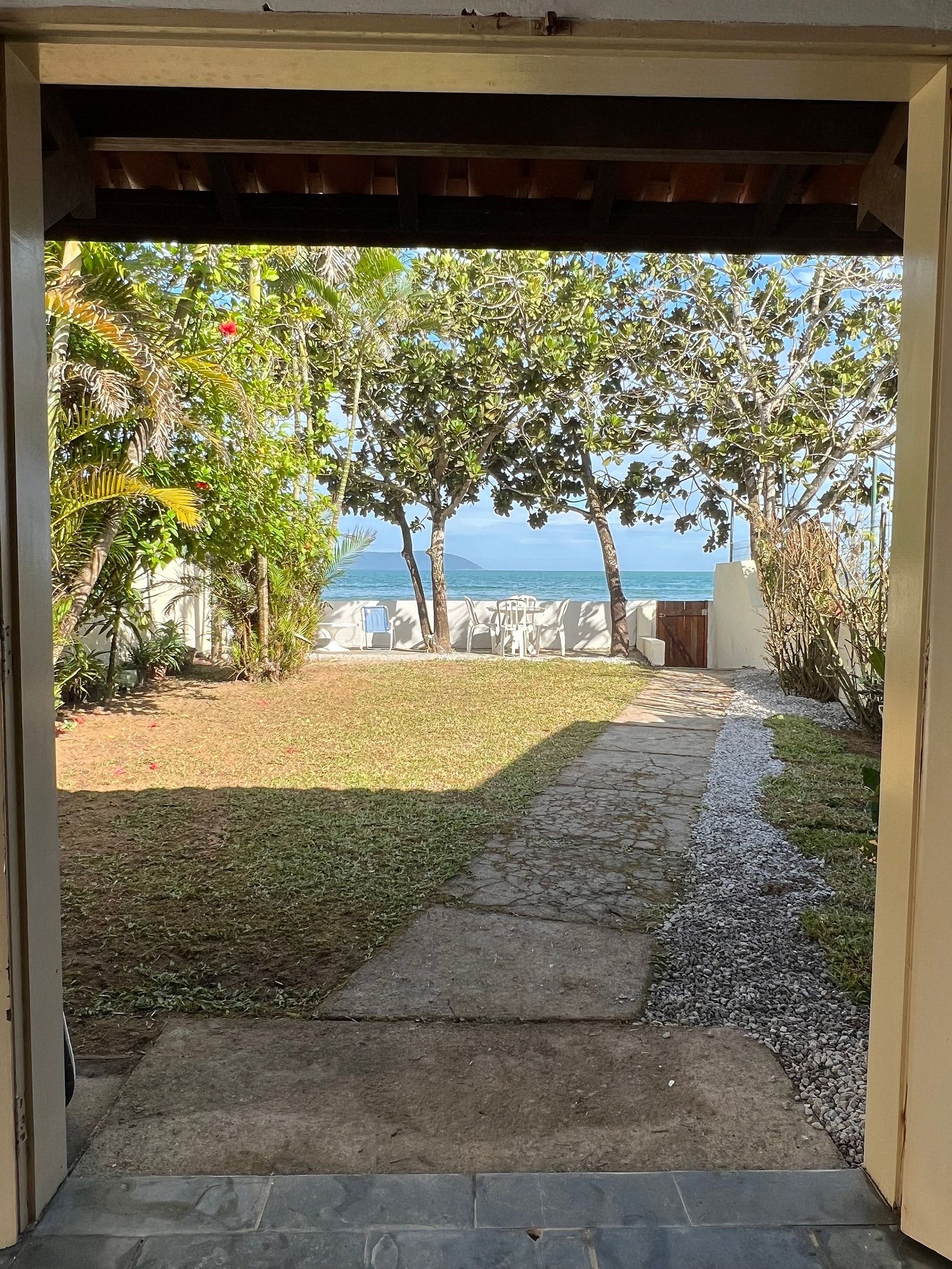 O jardim é um convite ao relaxamento, com mesa ao ar livre sob árvores que oferecem sombra natural tanto no jardim quanto na praia, proporcionando momentos tranquilos e rejuvenescedores. A cozinha completa inclui todos os utensílios necessários, uma geladeira duplex, cooktop 4 bocas e forno inox, ideal para preparar refeições deliciosas enquanto se desfruta da vista para o mar.